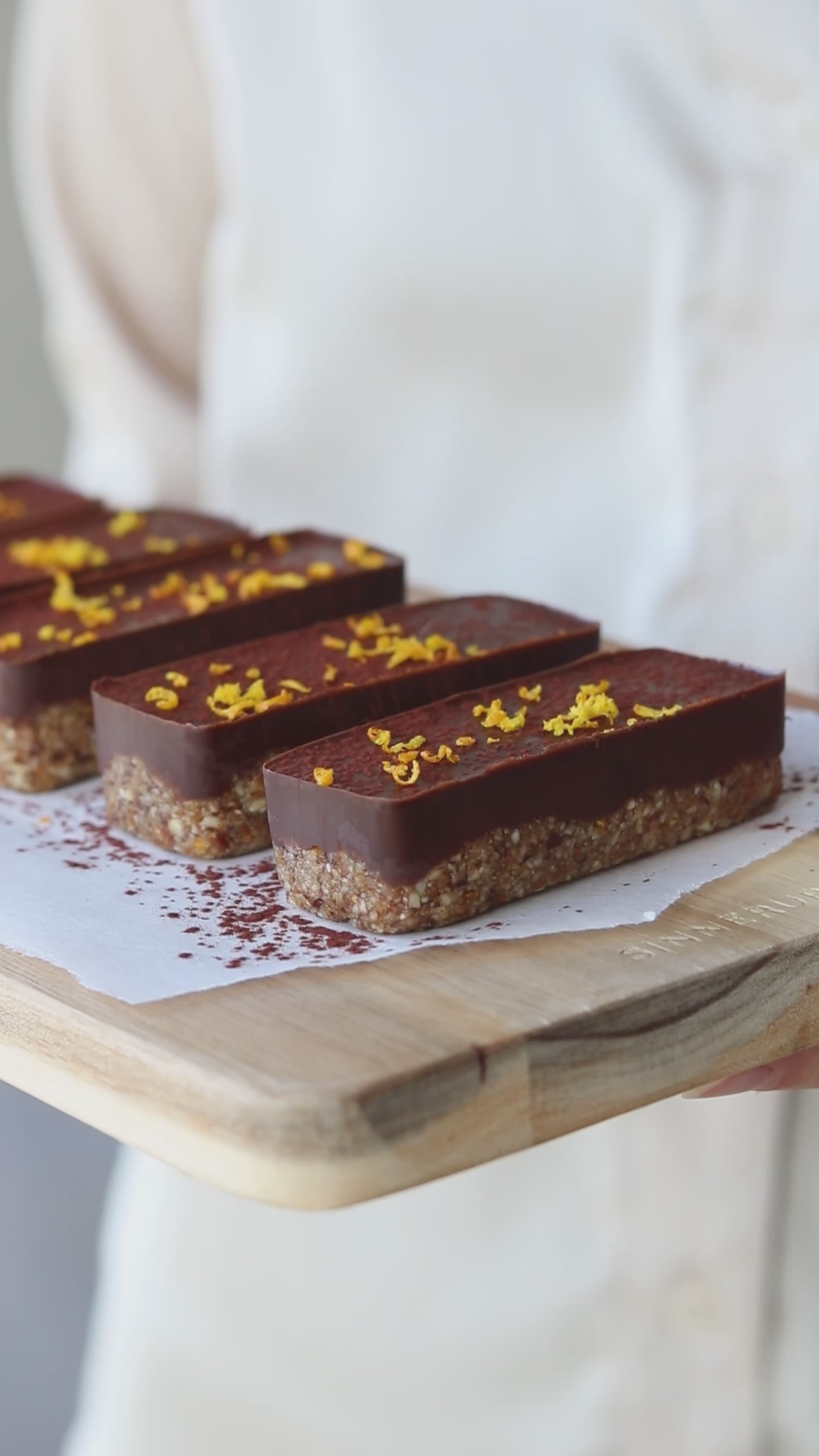 Del massen i 8 lige store stykker og pres dem jævnt ud i en bageform med 8 rektangler. Smelt chokoladeknapperne og bland peanutbutter heri. Rør rundt indtil det har en ensartet konsistens. Fordel chokoladeblandingen ligeligt over bundene. Sæt dem i køleskabet i minimum et par timer, hvorefter kagerne kan tages ud af formen. Drys med lidt kakaopulver og revet appelsinskal oven på kagerne.